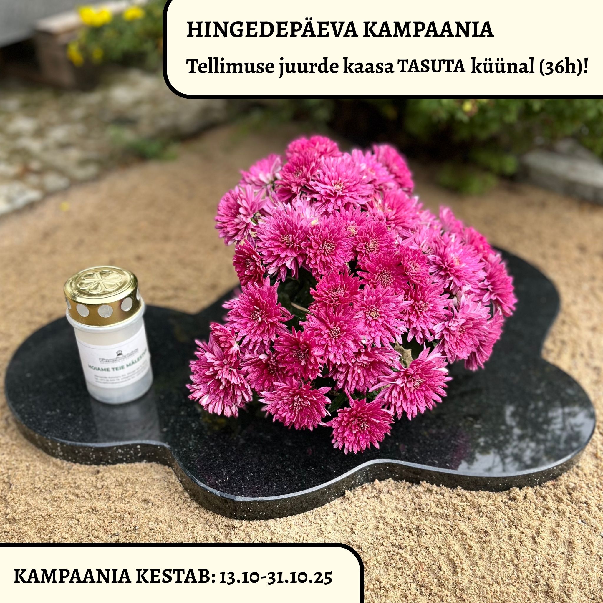 • Järeletulemine – soovi korral saab toote kätte ka meie töökojast Pärnamäe kalmistul (24. kvartal).